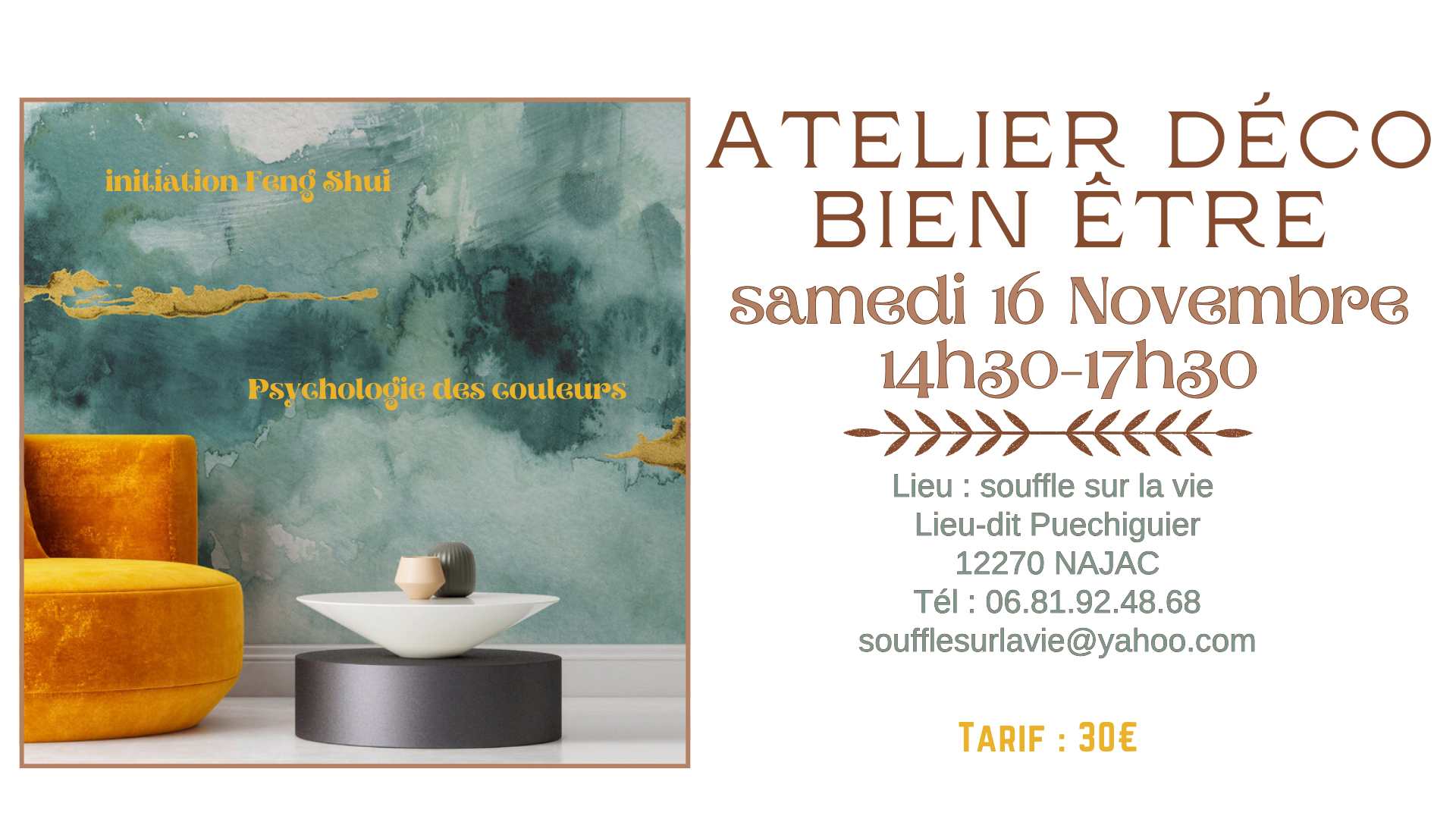 ✅ Description : Cet atelier est une initiation à la décoration thérapeutique qui consiste à utiliser des outils du Feng Shui, des la psychologie des couleurs et de la décoration pour faire en sorte que votre pièce soit harmonieuse et que vous vous y sentiez bien (meilleur sommeil, concentration, énergie, douceur... ).
